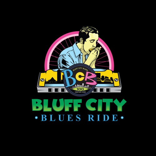 Logo where harnoniulca is center. Harmonica in image. Memphis on harmonica. Bikes and Memphis skyline We also wa